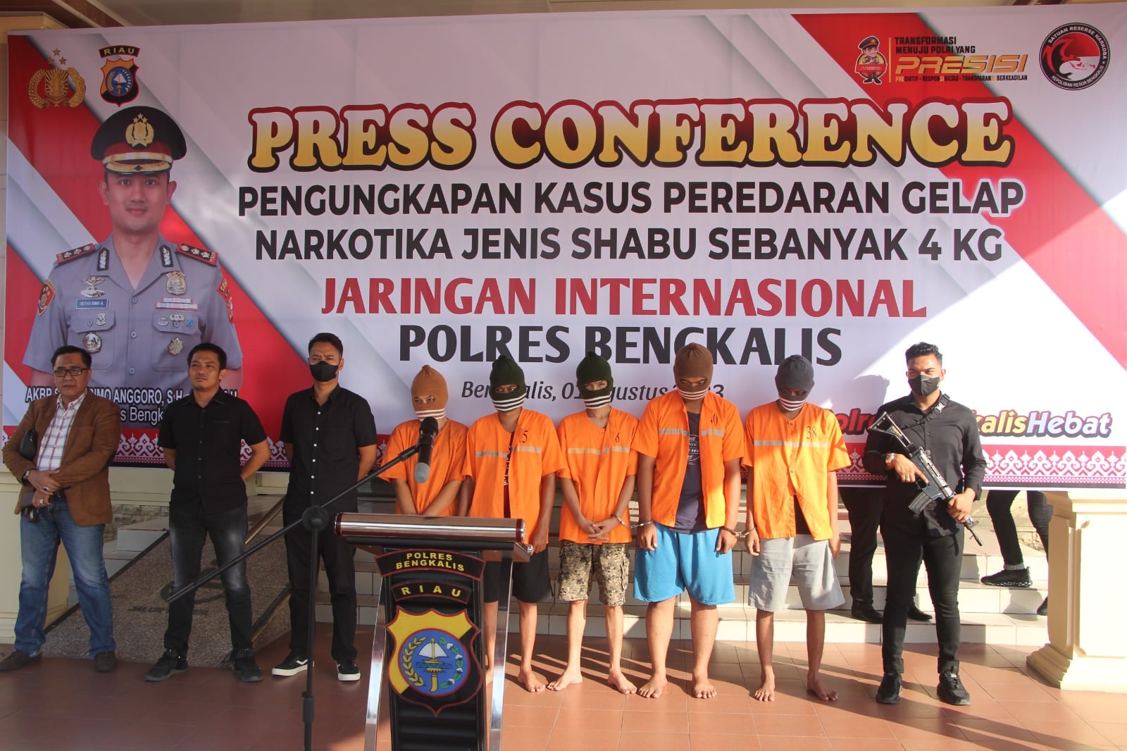 BENGKALIS:Riaunet.com~Kapolres Bengkalis AKBP Setyo Bimo Anggoro pimpin konferensi pers terkait tindak pidana narkotika jenis sabu seberat 4 Kg. Kejadian tersebut terjadi pada hari Rabu, tanggal 26 Juli 2023, sekitar pukul 10.00 WIB di loket travel yang beralamatkan di Jalan Pelabuhan Roro, Desa Air Putih, Kecamatan Bengkalis, Kabupaten Bengkalis.