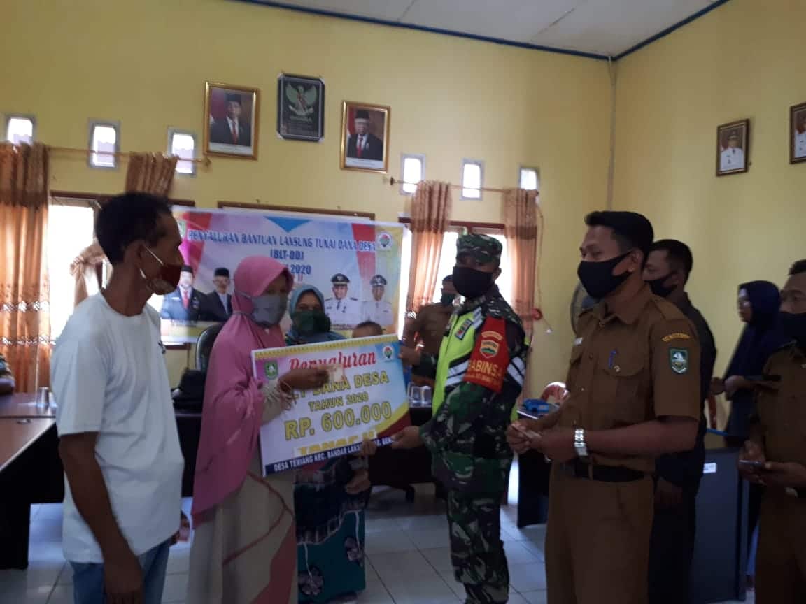 BANDAR LAKSAMANA:Riaunet.com~ Babinsa Koramil 07/Bukit Batu Kabupaten Bengkalis ikut mengawasi penyaluran Dana Bantuan Langsung Tunai Dana Desa (BLT DD) dari Kementerian Desa (Kemendes), untuk masyarakat yang terdampak Covid-19 di Desa Temiang, Kecamatan Bandar Laksamana, kabupaten Bengkalis,Rabu (10/6/2020).