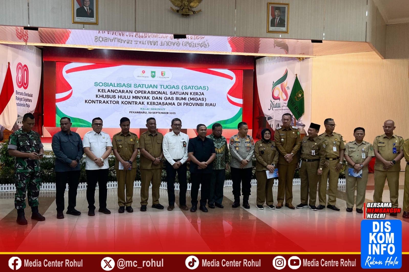 Rohul:Riaunet.com-Pemerintah Provinsi Riau bersama SKK Migas Perwakilan Sumatera Bagian Utara (Sumbagut) dan Kontraktor Kontrak Kerja Sama (KKKS) Hulu Migas menggelar Sosialisasi Satgas Kelancaran Operasional Hulu Migas di Gedung Daerah Balai Serindit, Selasa (30/9/2025).
