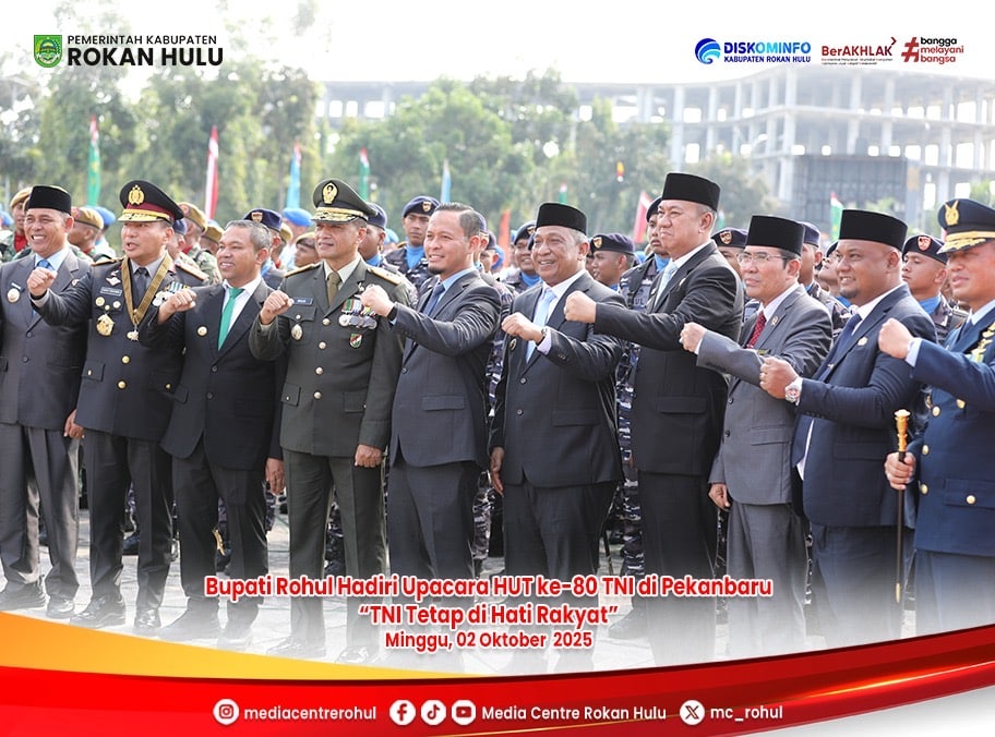 Dalam momentum istimewa ini, Bupati Rohul Anton menyampaikan ucapan selamat kepada seluruh jajaran TNI yang telah genap berusia 80 tahun. Ia menegaskan, keberadaan TNI yang tetap solid, profesional, dan dekat dengan rakyat merupakan kekuatan penting dalam menjaga keutuhan Negara Kesatuan Republik Indonesia (NKRI).