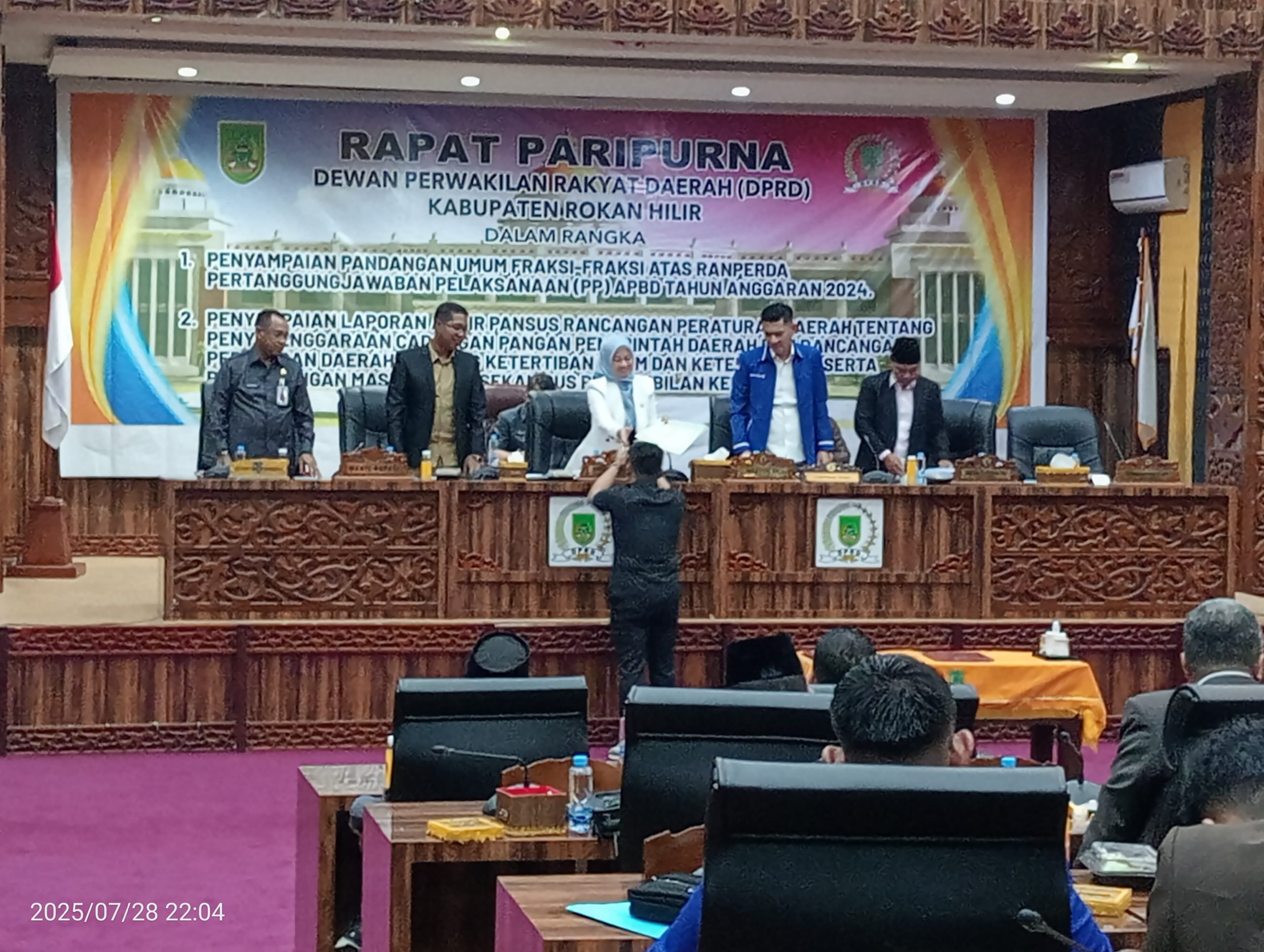 ROHIL:Riaunet.com~Fraksi-fraksi di Dewan Perwakilan Rakyat Daerah (DPRD) Kabupaten Rokan Hilir (Rohil) sampaikan pandangan umumnya terhadap pertanggungjawaban pelaksanaan Anggaran Pendapatan Belanja Daerah (APBD) Rohil tahun 2024, Selasa (29/7/2025) di aula sidang utama Kantor DPRD Rohil Jalan Lintas Pesisir Batu Enam, Rohil, Provinsi Riau.