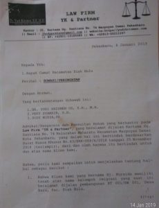 Akan hal tersebut diatas, Team Law Firm YK dan Parter yang di Pimpin DR Yudi Krismen Us.,SH,MH lakukan Somasi. Selasa (08/01/2019) yang ditujukan kepada Camat Siak Hulu Kab.Kampar