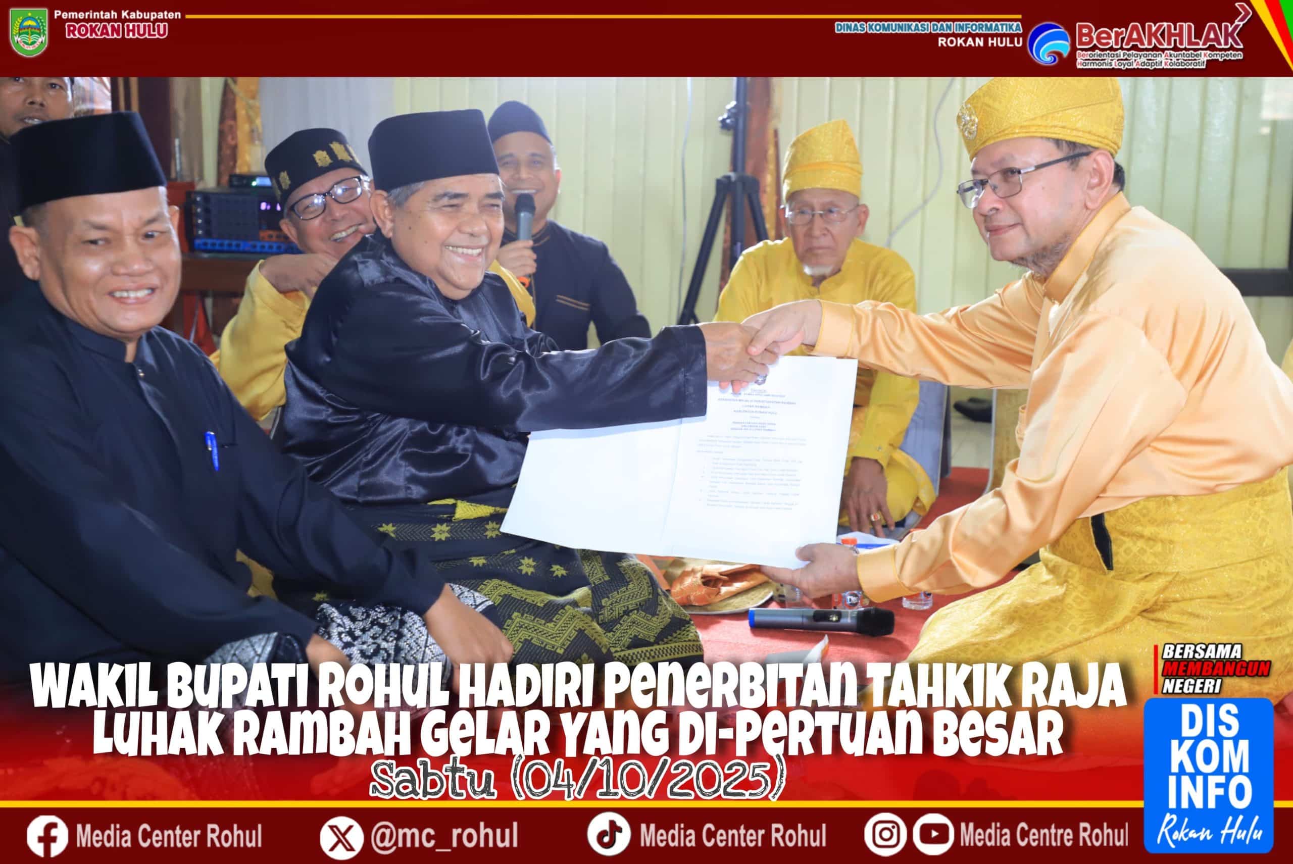 Melalui mufakat bersama setiap pihak terkait, Penabalan Raja Luhak Rambah Gelar Yang Dipertuan Besar dr. H. Tengku Afrizal Dachlan, M.M akan dilaksanakan pada Kamis (09/10/2025), hal ini menjadi momen penting mengingat telah terjadinya kekosongan penerus sejak tahun 2003. (FR/MCDiskominfo).