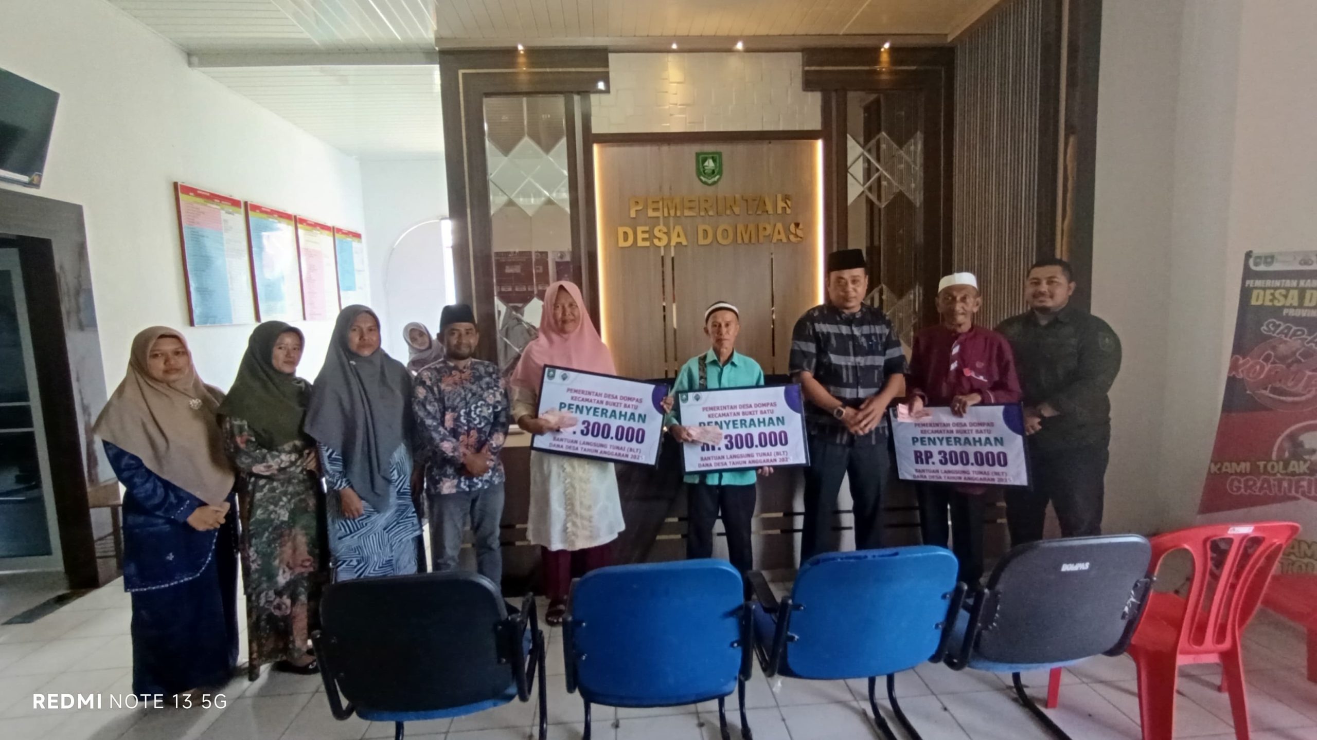 Bukit Batu:Riaunet.com~Pemerintah Desa (Pemdes) Dompas, Kecamatan Bukit Batu, Kabupaten Bengkalis, menyalurkan Bantuan Langsung Tunai Dana Desa (BLT-DD) tahap I kepada 28 Keluarga Penerima Manfaat (KPM). Kegiatan berlangsung di ruang kantor Desa Dompas dan dihadiri oleh perangkat desa, BPD, serta masyarakat penerima bantuan, (18/3/2025).