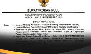 Bupati secara resmi menunjuk dan mempercayakan amanah Pelaksana Tugas (Plt) Sekda kepada Drs. H. Yusmar, M.Si. Penunjukan ini tertuang dalam Surat Keputusan Bupati Rohul Nomor: 100.3.5.2/BKPP-MT/78.19/2026 yang ditandatangani pada Kamis malam (2/4/2026) pukul 22.00 WIB.