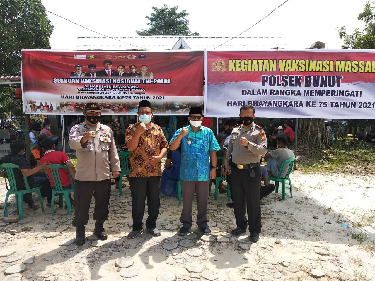 BUNUT:Riaunet.com~Dalam rangka memeriahkan Hari Ulang Tahun (HUT) Bhayangkara ke-75 Tahun 2021, Kepolisian Sektor Bunut Polres Pelalawan bekerja sama dengan pihak Kecamatan Bandar Petalangan dan Puskesmas Madani Bandar Petalangan gelar kegiatan vaksinasi massal.